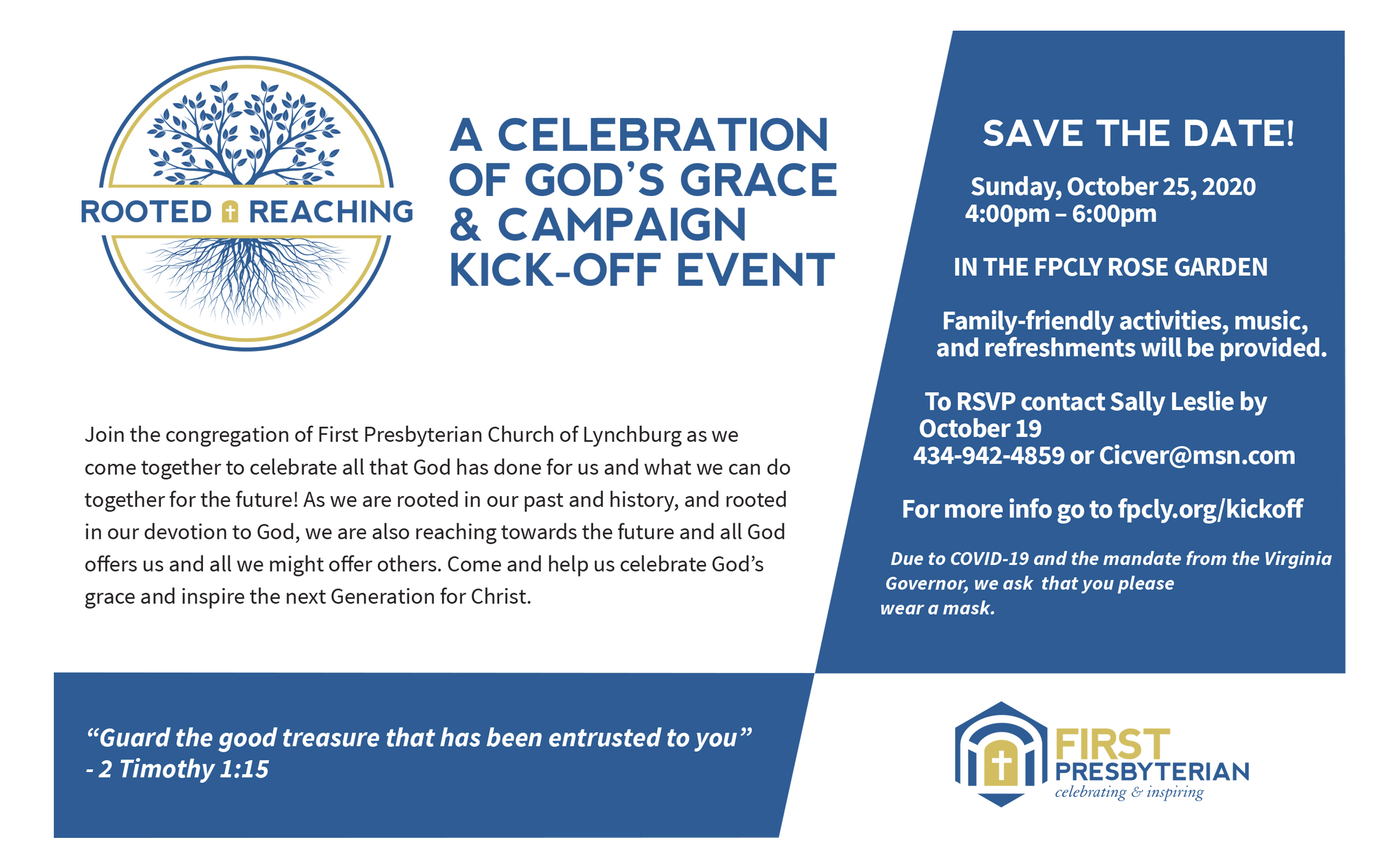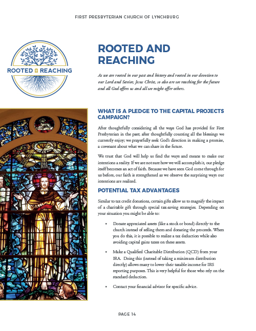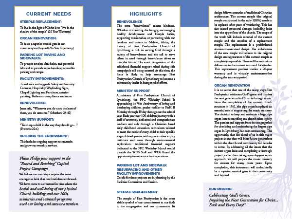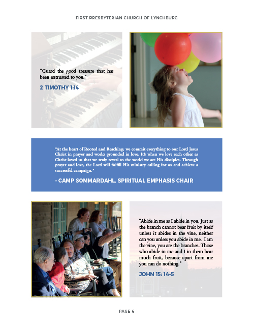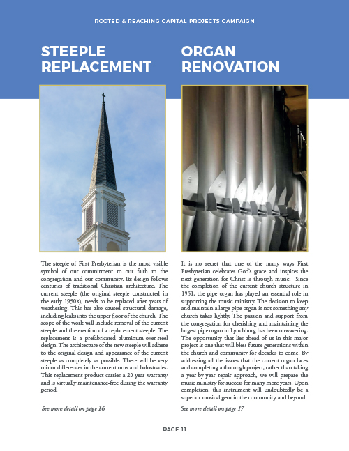 In order to get this Capital Campaign started, First Presbyterian Church of Lynchburg knew that they needed a theme. They came up with the slogan “Rooted & Reaching” as a way to engage their target and celebrate what this campaign meant. This stood for: