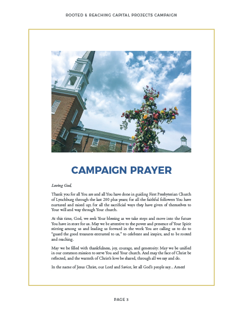 The main conversational piece was the booklet. This booklet served as a guide for FPCLY representatives to hold a conversation about the capital campaign with specific individuals. It was also a nice coffee table piece that could be kept and looked at throughout the year.